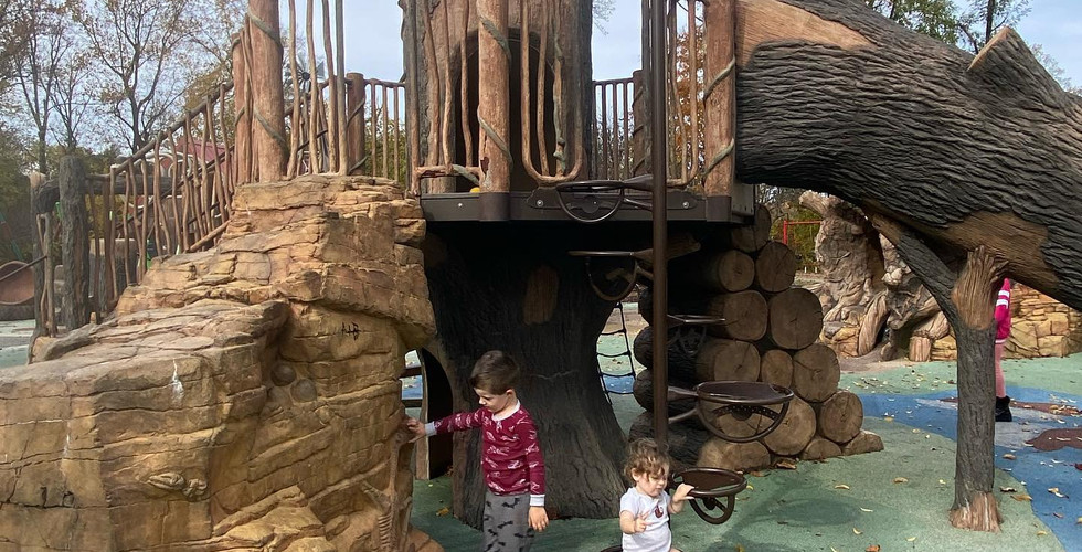 The playground is called the “Woodland Wonderland,” and we’re here to tell you it does not disappoint. You’ll start to see the playground on top of the hill to the right directly after you turn into the park. (There’s flat, paved pathways up to it so you can walk a stroller there like we did.) The structures aren’t your typical playground fare and are so unique and fun. Many look like trees and wooden buildings. Keep an eye out for hidden creatures. One of the little houses makes music. Enjoy a bite to eat under the giant toadstools. And during the warmer months, the giant cattails spout water and make a “misting park.”